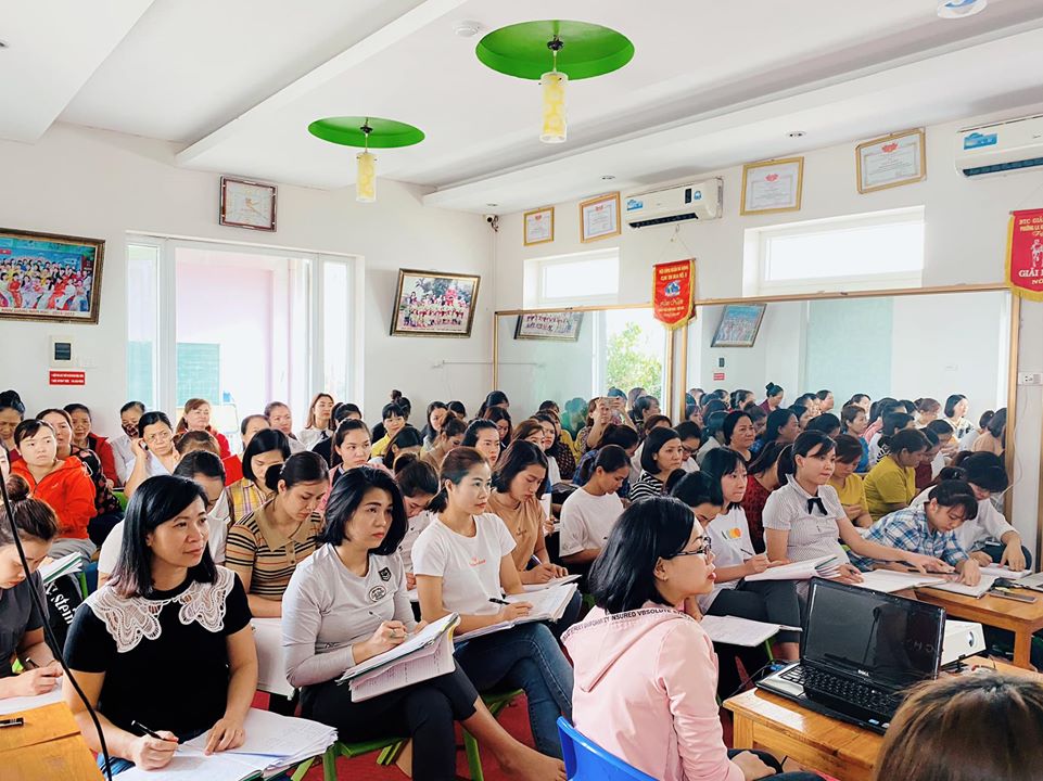 Để chuẩn bị đón các con trở lại trường học, nhà trường phối hợp với cán bộ y tế trường tổ chức tập huấn, hướng dẫn cho CBGVNV trong trường cách đeo khẩu trang, đo thân nhiệt, vệ sinh khử khuẩn môi trường lớp và đồ dùng đồ chơi bằng cloramin B...