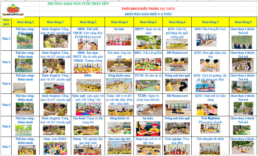 Thời khoá biểu khối mẫu giáo nhỡ - Tháng 10/ 2023