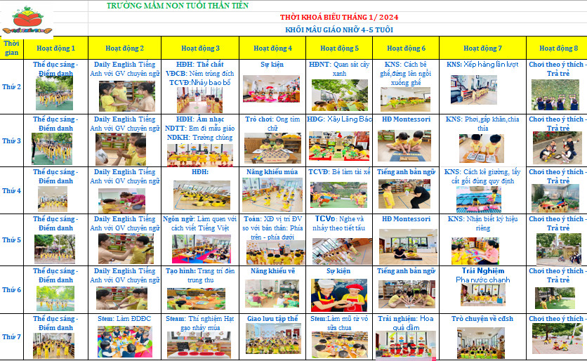 Thời khoá biểu tháng 1/ 2024 - Khối mẫu giáo nhỡ ( 4 - 5 tuổi )