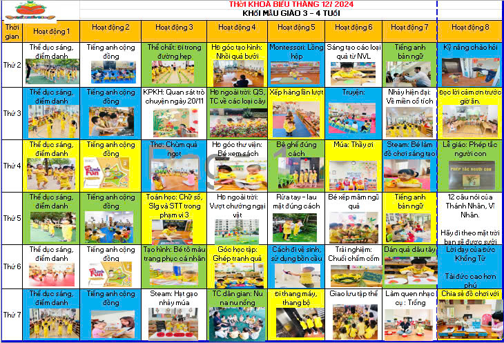 Thời khoá biếu tháng 12/ 2024 - khối mẫu giáo bé ( 3 - 4 tuổi )