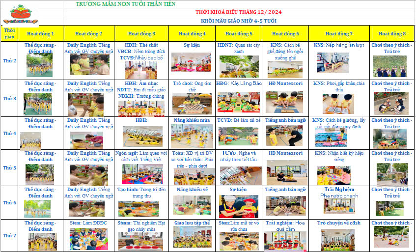 Thời khoá biếu tháng 12/ 2024 - khối mẫu giáo nhỡ ( 4 - 5 tuổi )