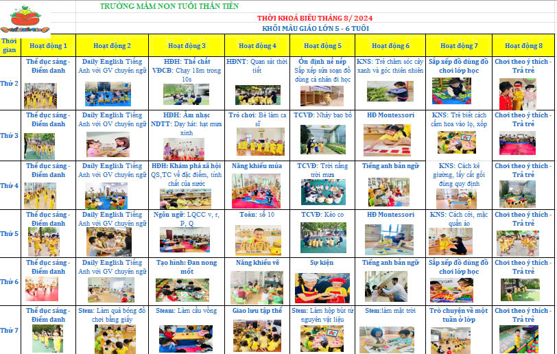 Thời khoá biếu tháng 8/ 2024 - khối mẫu giáo lớn ( 5 - 6 tuổi )