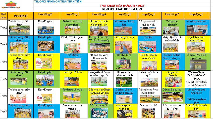 Thời khoá biểu tháng 8/ 2025 khối mẫu giáo bé 3 - 4 tuổi