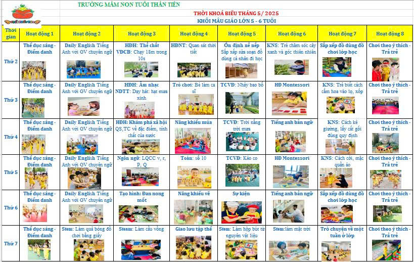 Thời khoá biểu tháng 8/ 2025 khối mẫu giáo lớn 5 - 6 tuổi