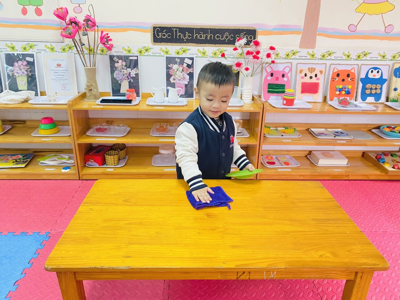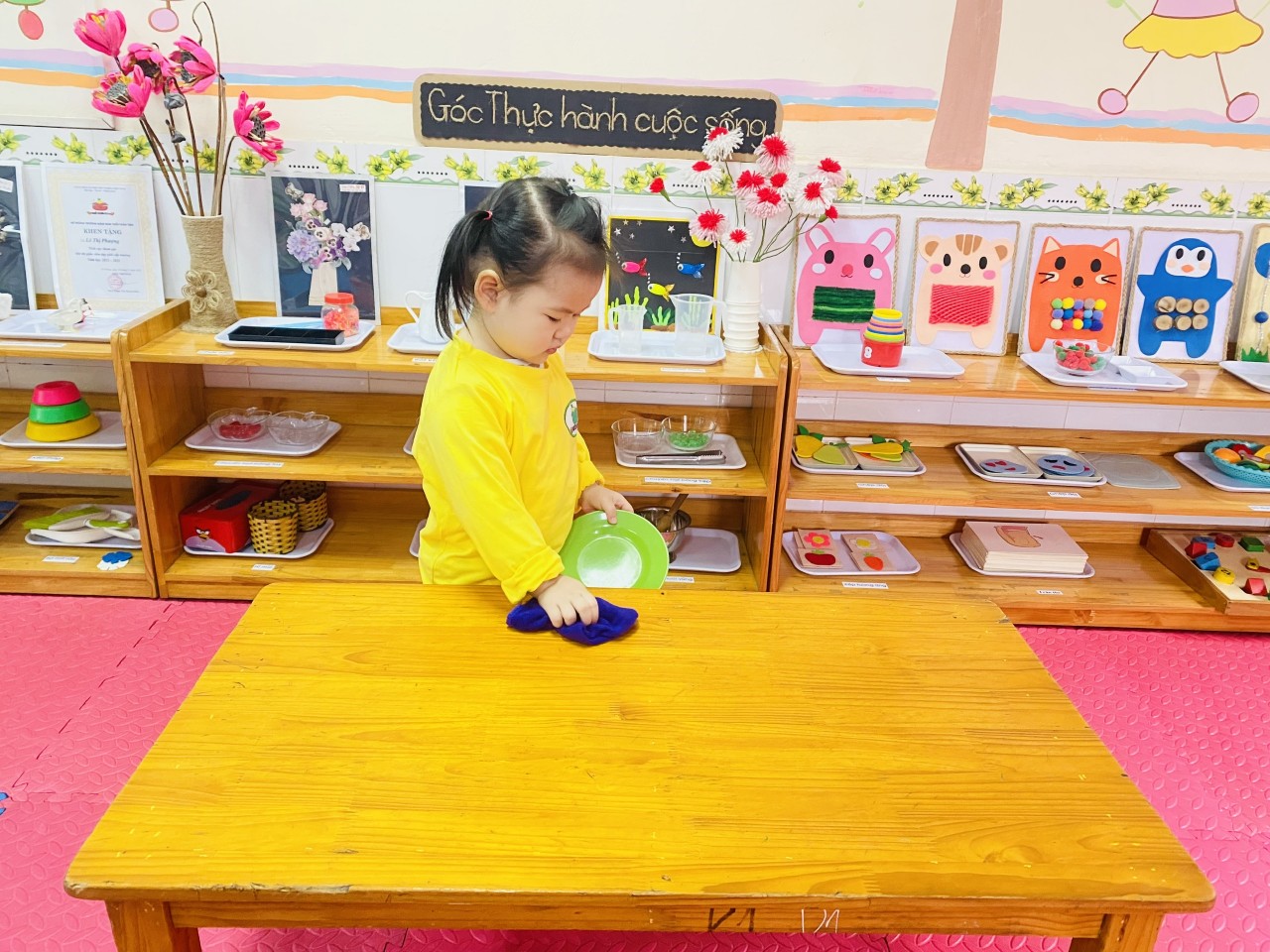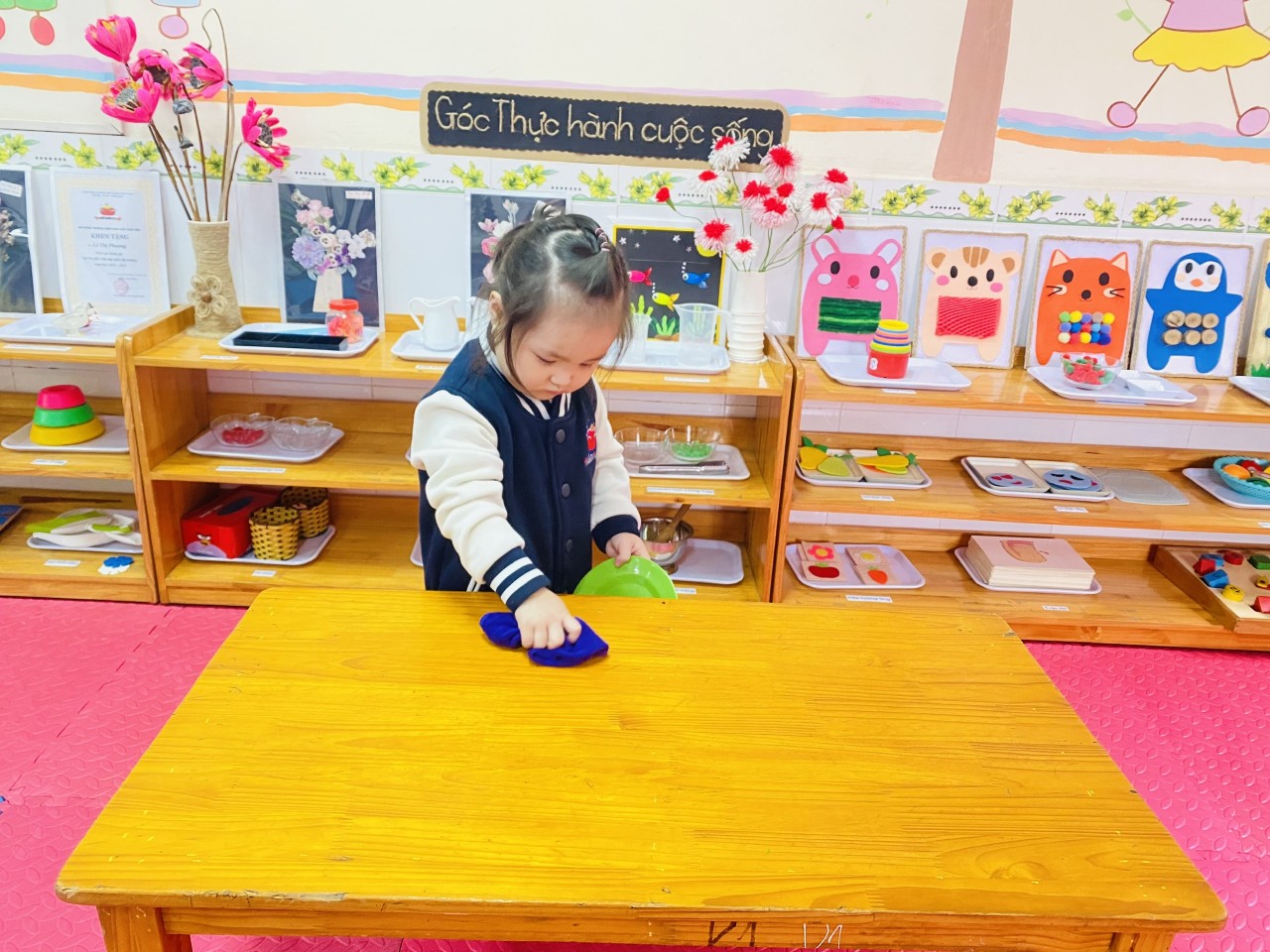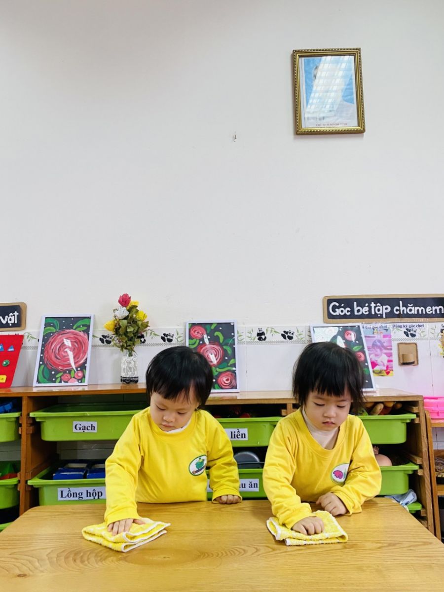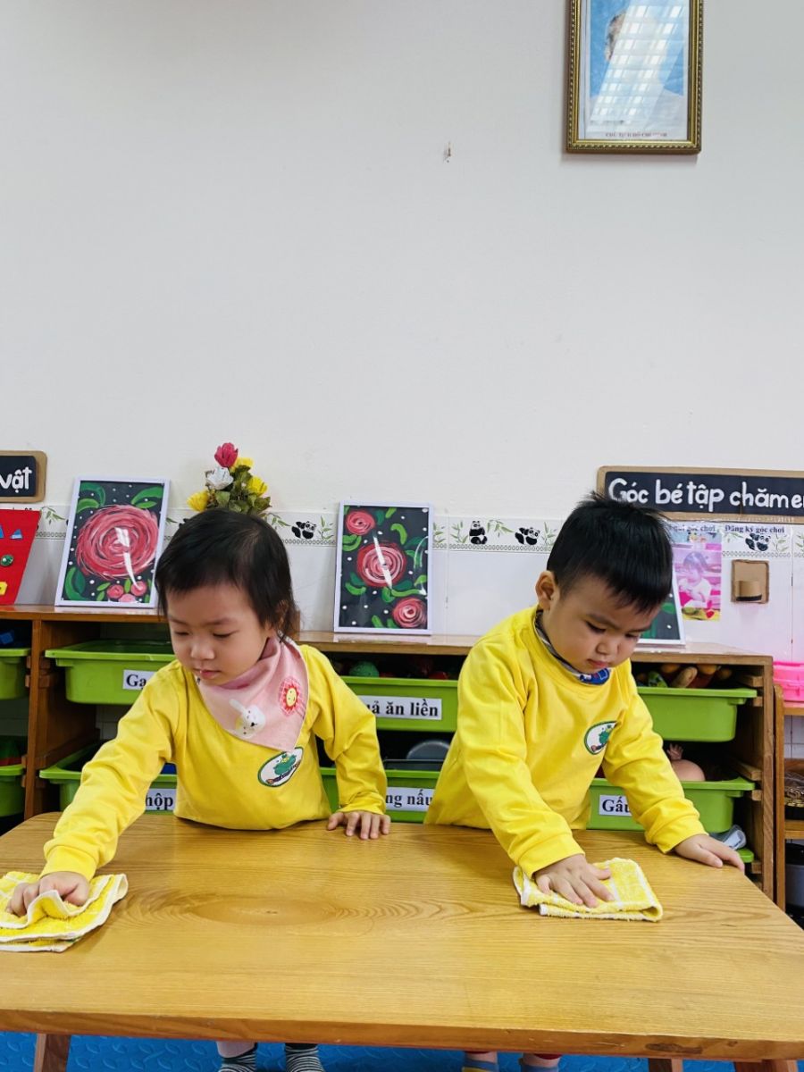 Kỹ năng dùng khăn lau nước đổ ra bàn (khối nhà trẻ)