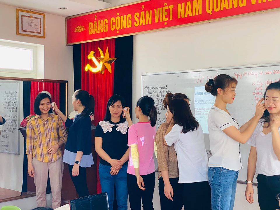 Để chuẩn bị đón các con trở lại trường học, nhà trường phối hợp với cán bộ y tế trường tổ chức tập huấn, hướng dẫn cho CBGVNV trong trường cách đeo khẩu trang, đo thân nhiệt, vệ sinh khử khuẩn môi trường lớp và đồ dùng đồ chơi bằng cloramin B...