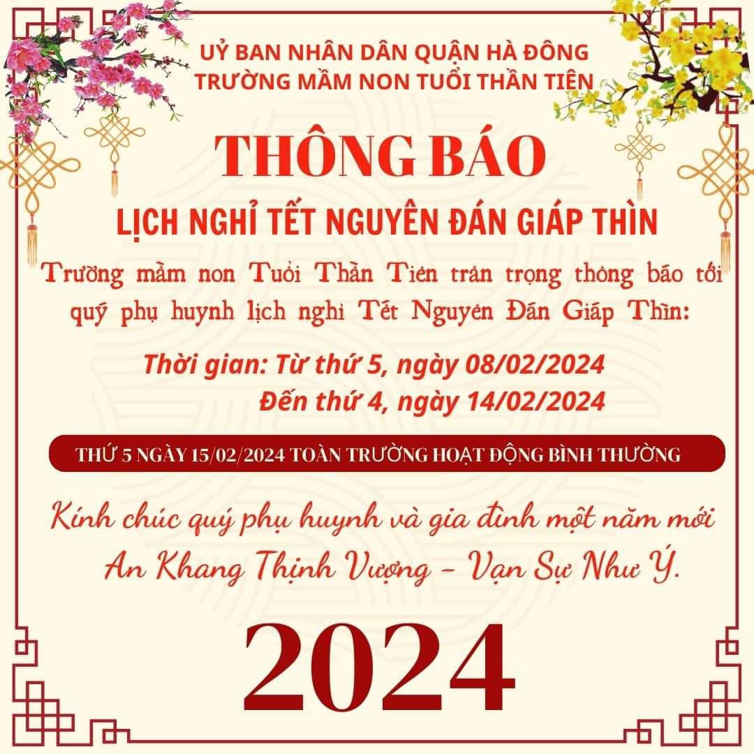 Thực hiện quyết định số 29/PGD - VP ngày 16/1/2024. Trường mầm non Tuổi Thần Tiên gửi lịch nghỉ tết Giáp Thìn như sau: